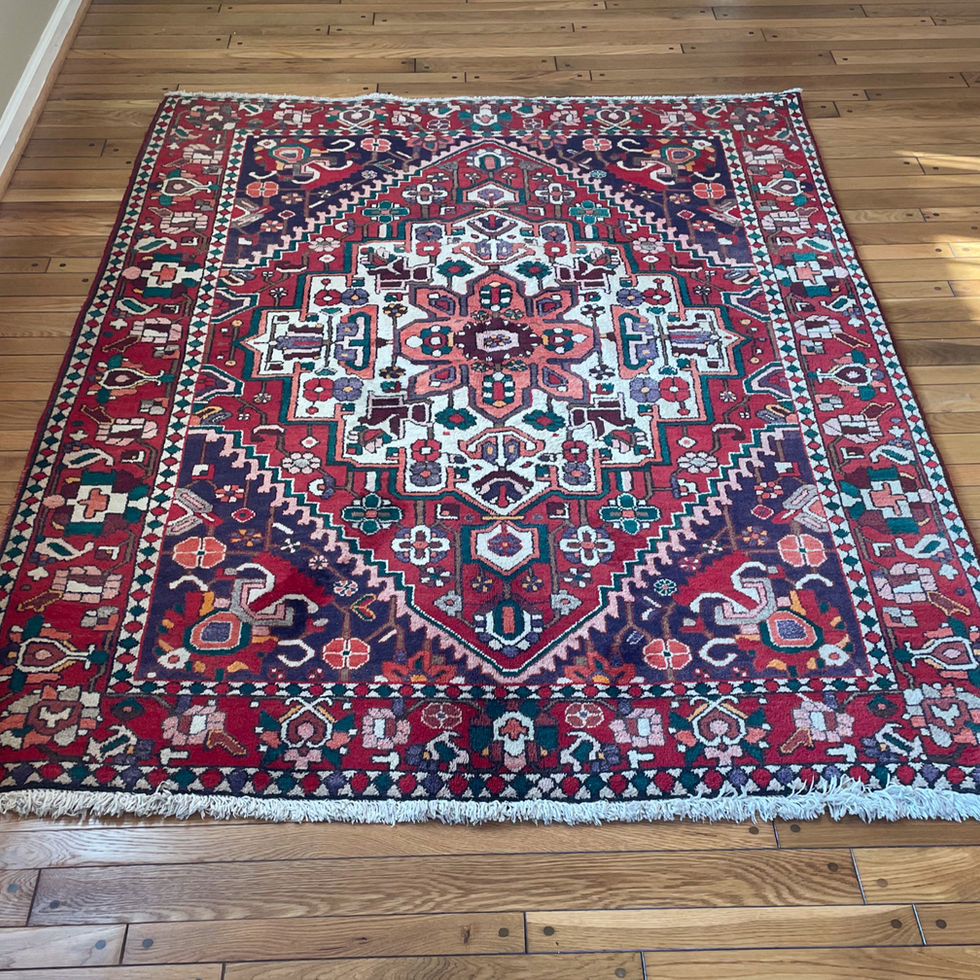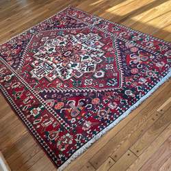 This Bakhtiari Rug This striking Persian rug captivates with its dynamic geometric composition and rich color palette. The central medallion, woven in ivory and deep red, is adorned with intricate floral and tribal motifs, evoking a sense of heritage and craftsmanship. The stepped lozenge field adds depth and movement, framed by a bold navy and crimson border decorated with symbolic figures and stylized rosettes.